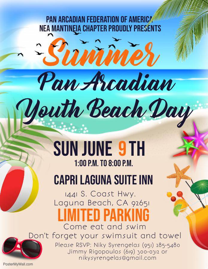 NEA MANTINEIA #102 Los Angeles is hosting a SUMMER PAN ARCADIAN YOUTH BEACH DAY and inviting the young adults of the PFA West District to attend. A flyer with all the information is included with this email.